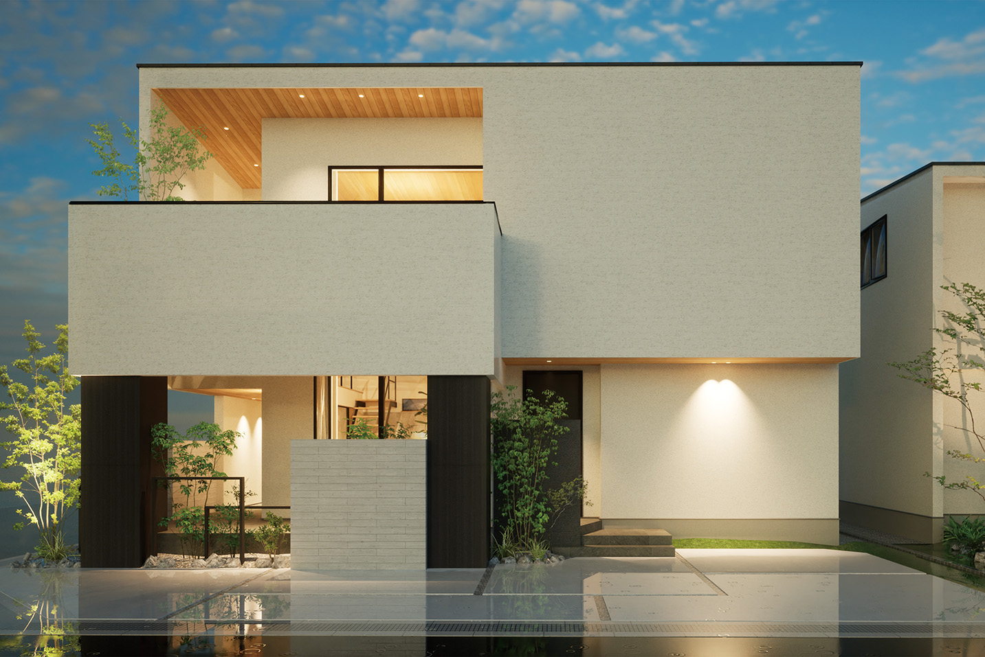 やわらかな色味と木目、タイルの組み合わせに、植栽の緑が彩りを添えるエクステリアデザイン。街並みにも調和し、道行く人の印象にも残る、上品な佇まいをつくり出します。